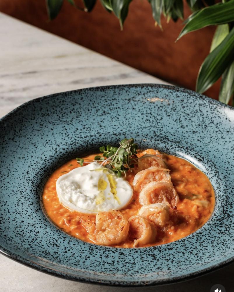 Risoto de camarão com tomate seco e toque de ervas, finalizado com burrada cremosa e azeite trufado