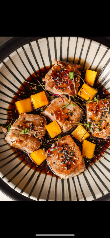 pedaços de atum selados com gergelim com cubos de manga e molho especial da casa com toque de ostras
