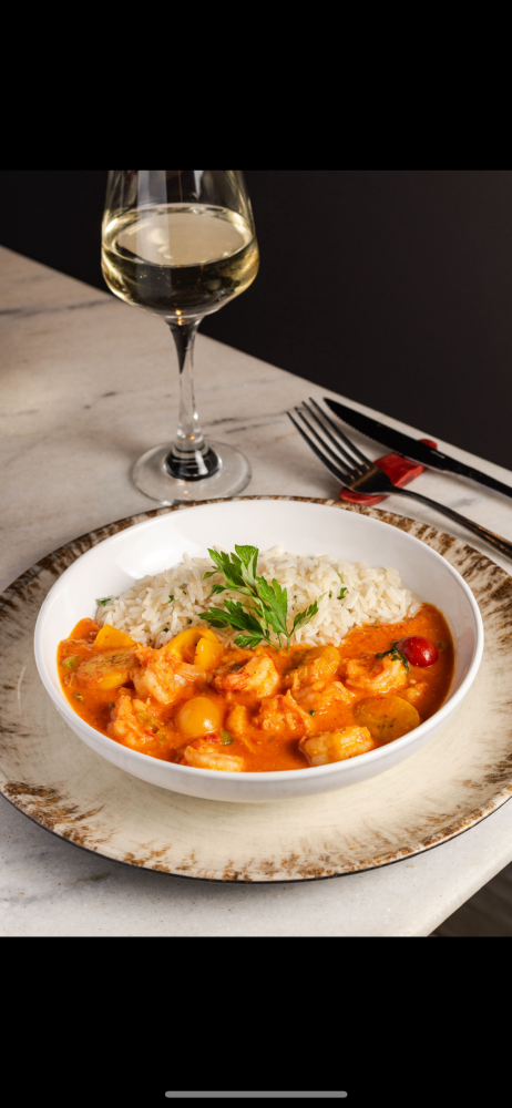 Camarões, leite de coco, tomate, pimentão, cebola, coentro e um toque de azeite de dendê. Acompanha arroz branco e é uma verdadeira delícia