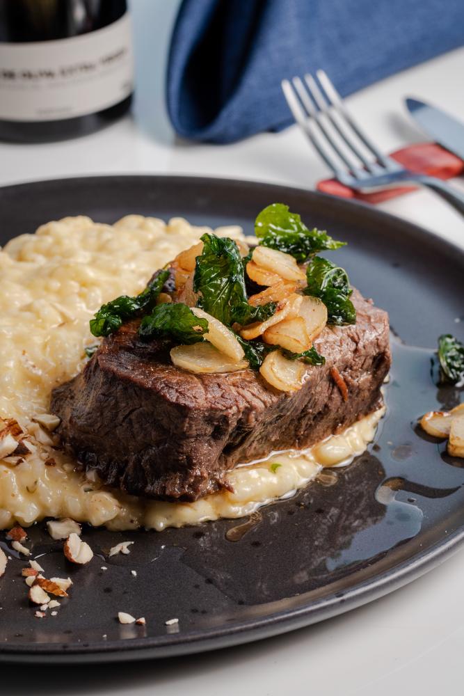 Filé alto grelhado finalizando no azeite de alho e hortelã com risoto de brie e alho-poró.