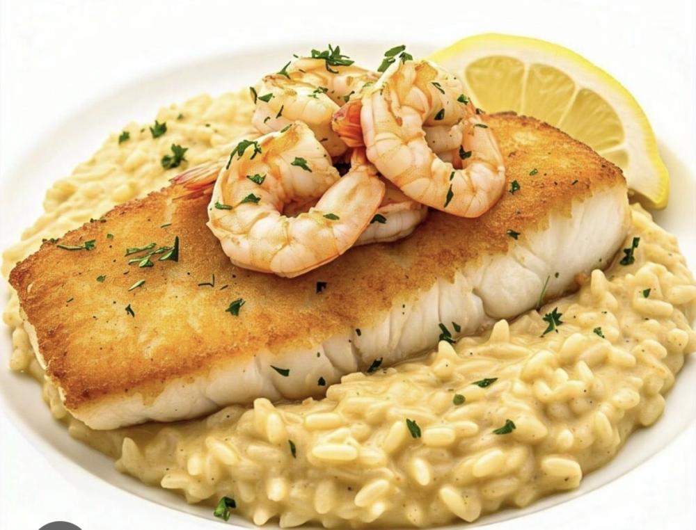 Robalo grelhado e finalizado na manteiga de ervas acompanhado de risoto de camarões com toque d e pomodoro