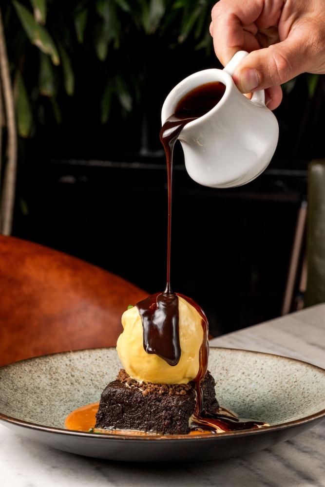 Torta búlgara com creme de chocolate e nutela acompanhado de sorvete de creme.