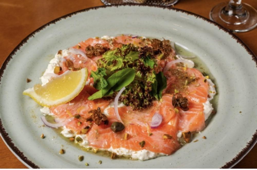 Salmão cru fatiado com creme sour e alcaparras finalizado no azeite trufado com lascas de parmesão